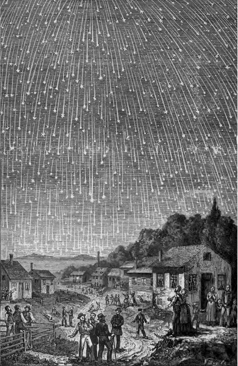 في عام 1833 شهدوا في امريكا الشمالية عاصفة نيزكية مذهلة تساقطت عليهم ملايين الشهب حيث اعتقد الكثير من المواطنين انها علامة لنهاية العالم